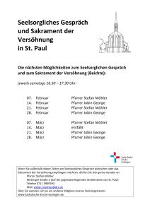 Die Beichte ist das Sakrament der Zuwendung Gottes gerade in unseren Fehlern und Sünden. Gott wagt mit einem jeden von uns einen Neubeginn, der ihm seine Sünden anvertraut und den inneren Willen besitzt sich zu Erneuern. Zu diesem Gespräch mit einem Priester laden wir Sie herzlich ein. Beichtgelegenheit gibt es wöchentlich